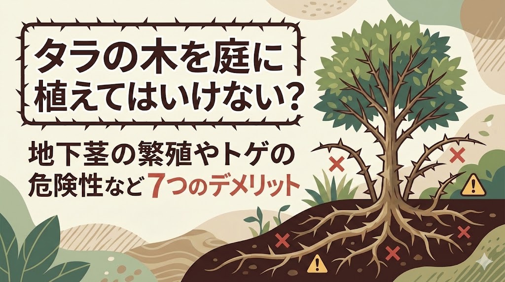 タラの木をお庭に迎えるなら、美味しい「タラノメ」というご褒美の代わりに、いくつかの試練を覚悟しなくてはいけません。見た目の野趣あふれる雰囲気は魅力的ですが、実際に生活圏内に植えるとなると、家族の安全や家の管理に大きな影響を及ぼします。